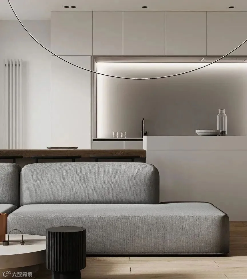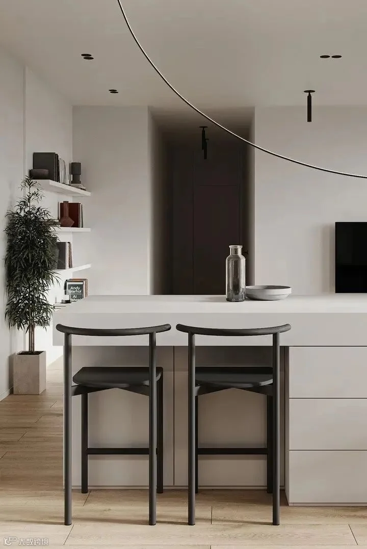 厨房中,细致线条带出简约的高级感。中岛连接着一段吧台高度形成落差,符合使用者习惯。