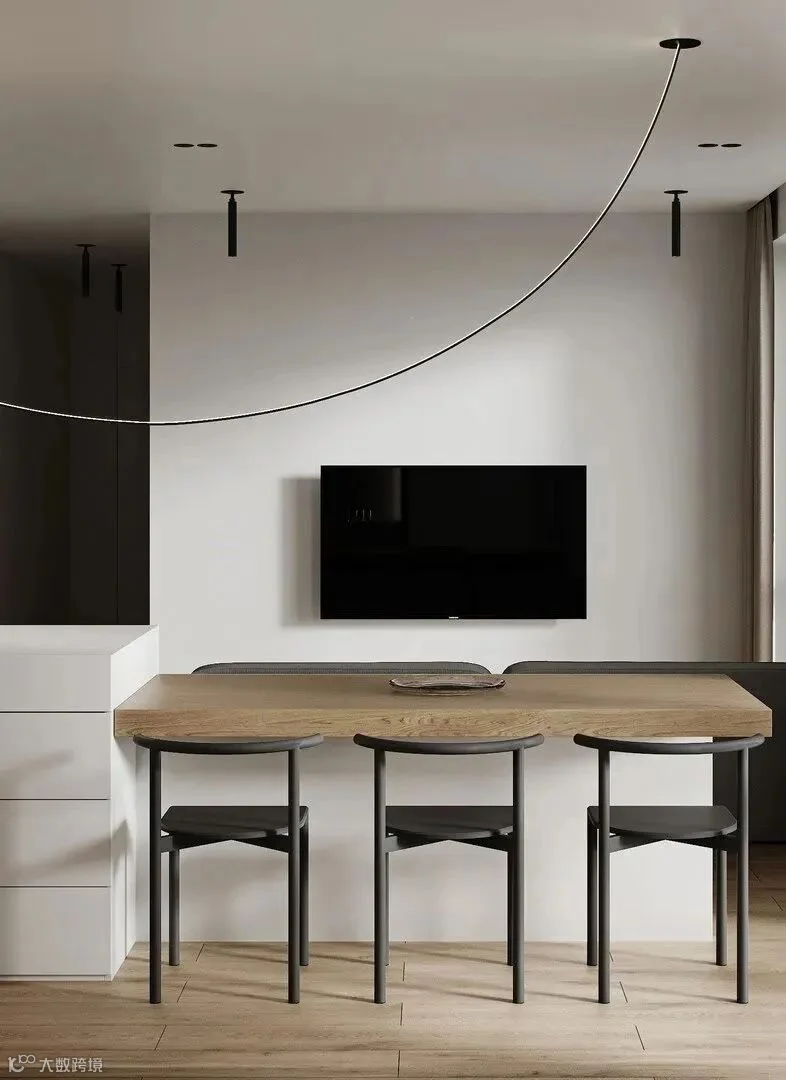 电视悬挂上墙,利用一段深色横板形成收纳台。