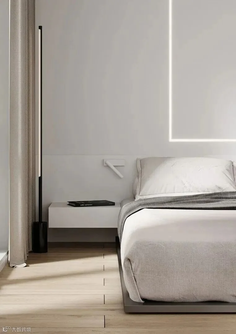 定制的床头柜简约大气,对应着上方黑色射灯,有很强的对称感。