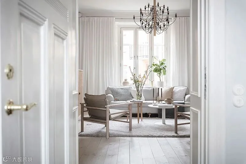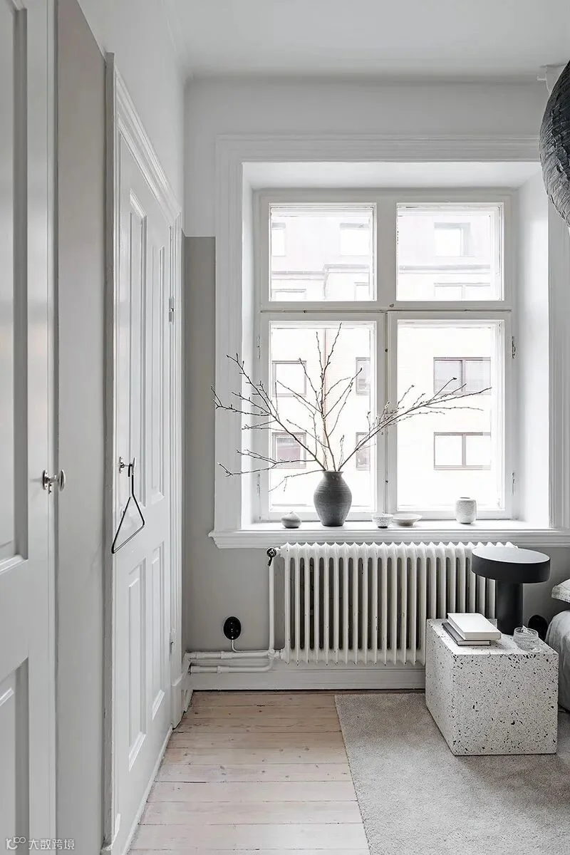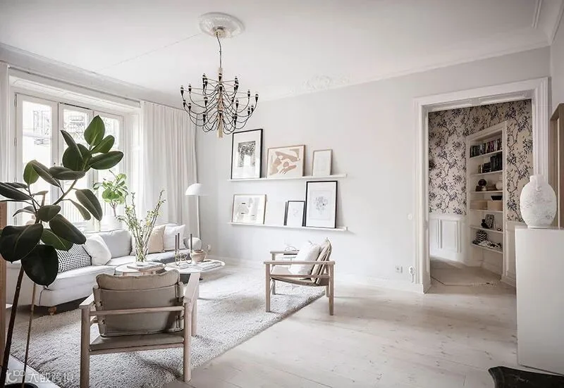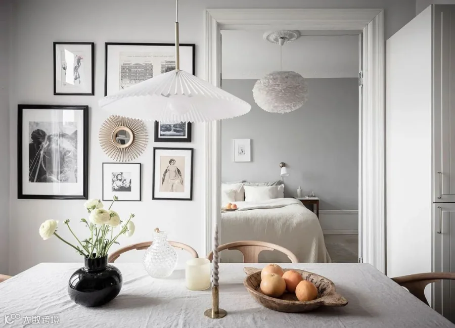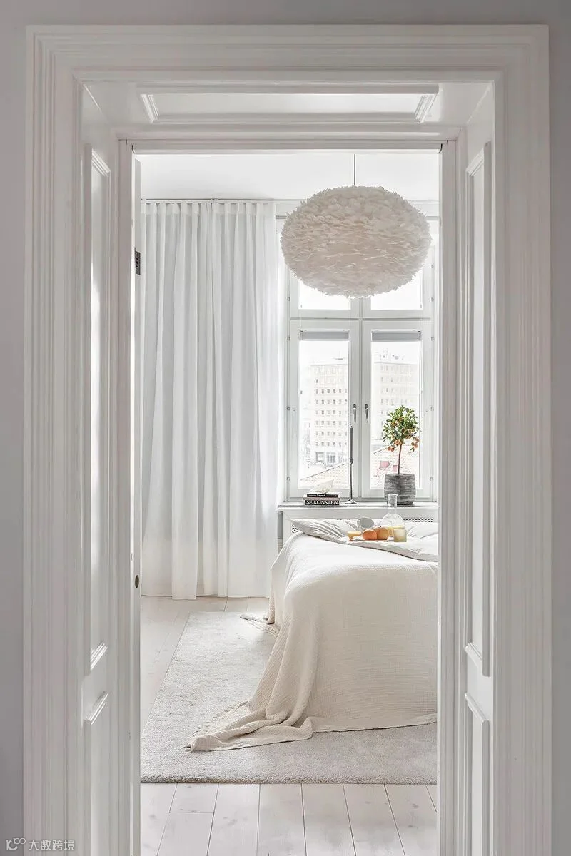 这间公寓的设计注重白色和自然采光,空间非常安静,室内装饰几乎完全是白色的,镜框墙面装饰和精致的纺织品为生活增添了必要的元素。
