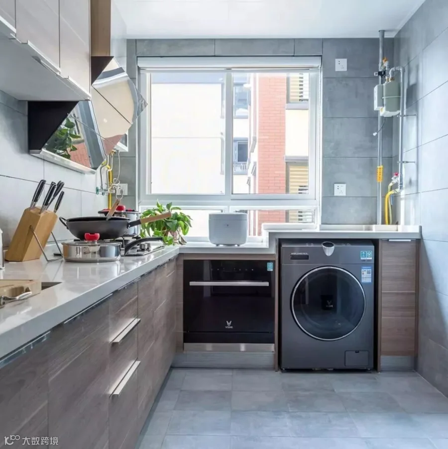 有些户型可能没有阳台,而且卫生间也不够大,可能正好厨房比较大,那么洗衣机放在厨房也可以的,英国公寓很早之前就有把洗衣机放在厨房的案例了。