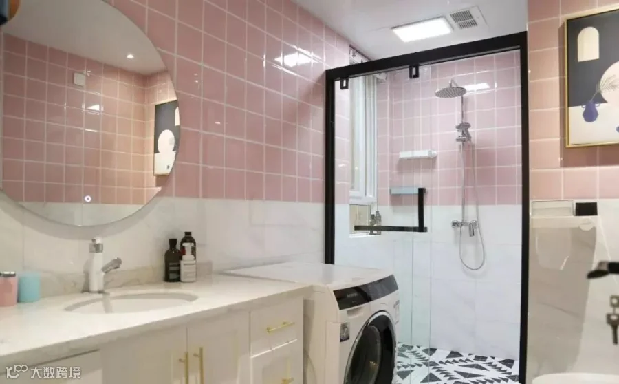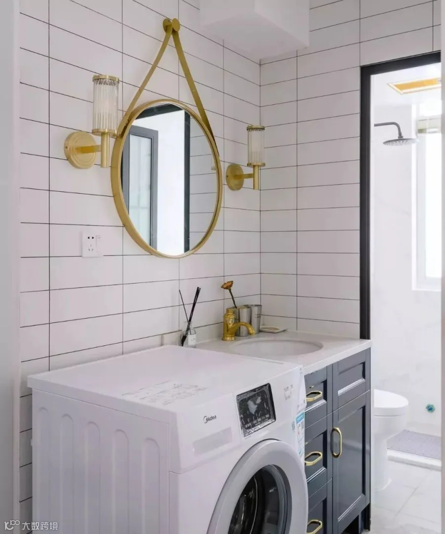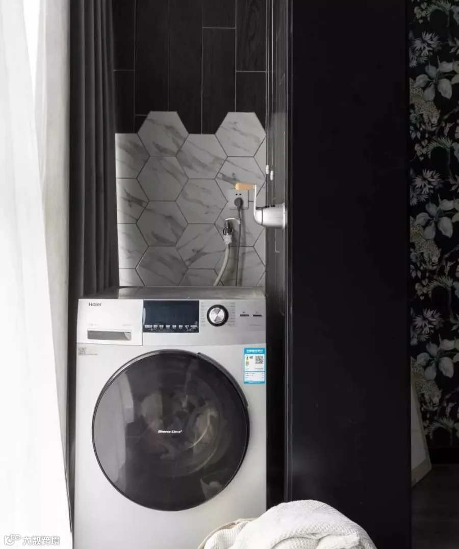 除了上面3种情况,其实还有很多案例把洗衣机安置在房子的各个角落的,我给大家举一些例子。比如卫生间做干湿分离,把洗衣机放干区。