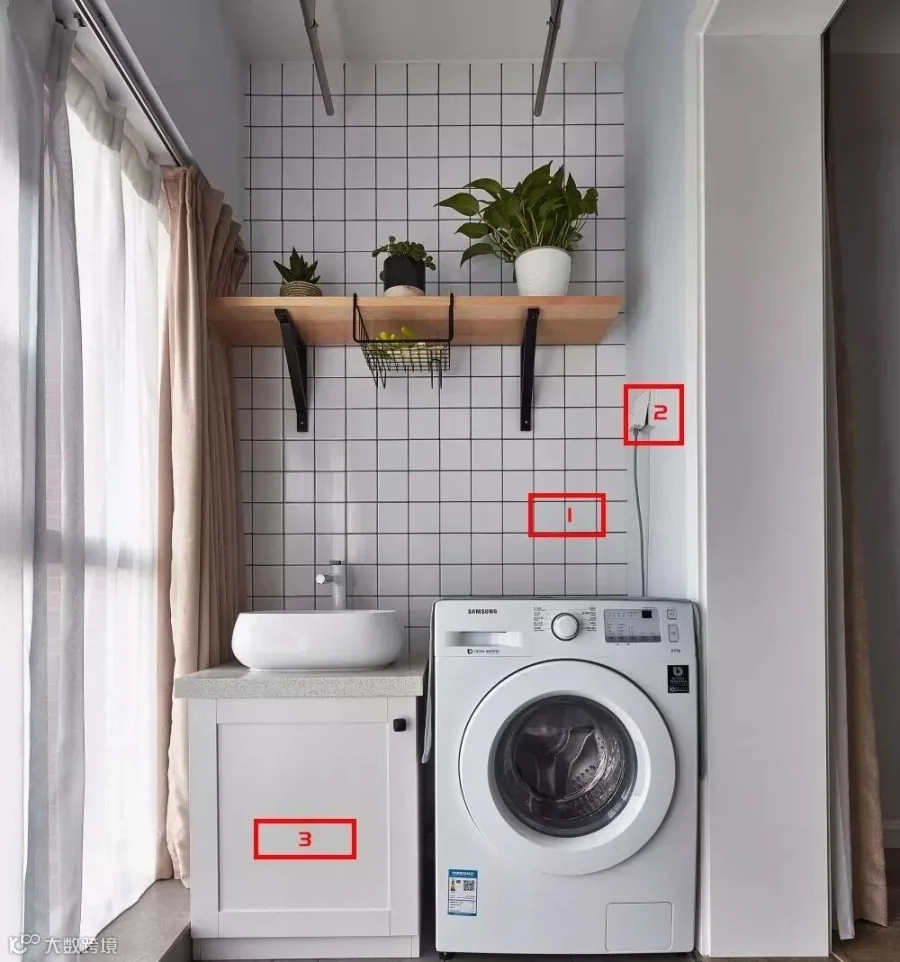 方案3,现在流行做洗衣柜,可以把洗衣机的进水阀和插座留在边上的台盆下方,也就是和台盆龙头的进水管留在一起,安装洗衣机的时候只要在洗衣柜中间的隔板留个洞,就能把进水管和插座穿过去。这种做法的优点是「隐形」。