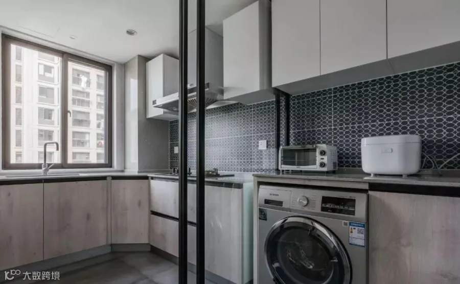 嫌厨房的油烟比较大的话,下面这个案例中正好厨房门外有一块位置,于是把洗衣机安排在了厨房外面的西厨区。