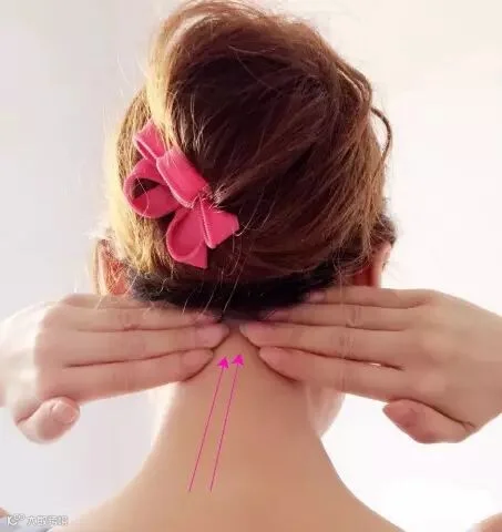用两手手指从脊椎骨由下到上的顺序轻轻以按推的按摩手法直到如图发际的位置(轻按风池风府穴)你一定要记住,按摩的手法要轻按推,不要用力过重,不然会受伤哦。