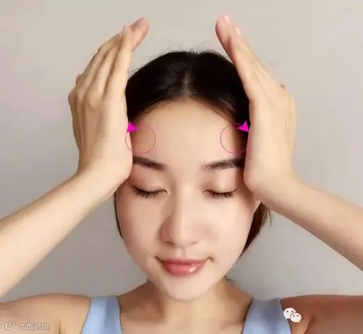 将两手手掌掌心,也就是肉比较多的那块,分别放在眉毛上方的位置,以打圈的方式轻按摩,要注意的是,你按摩的不是面部的肌肤,而是脸部骨骼,要有意识地去按摩骨骼,进行3—4次即可。