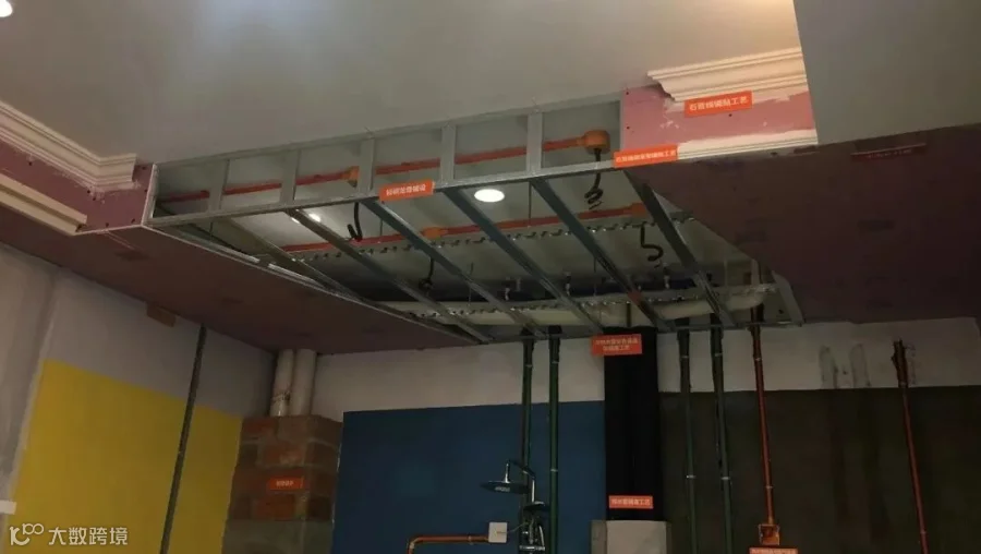 在木作施工环节,吊顶采用全轻钢龙骨固定,具有施工快、不易变形、平整度好、防火安全性高等优点。