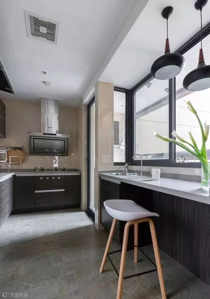 家里是简约风、工业风的话,不锈钢台面都是不错的选择。不锈钢台面号称最易清理的台面,除了它耐火耐高温易清洁,还因为它抗菌;而且不锈钢和人造石一样都可以做成无缝一体设计。