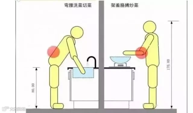 ③有人可能会说人的身高比例不协调,怎么办?那就站在台面前,肘关节成90度角再往下5cm左右,这个高度就是台面的正确高度。