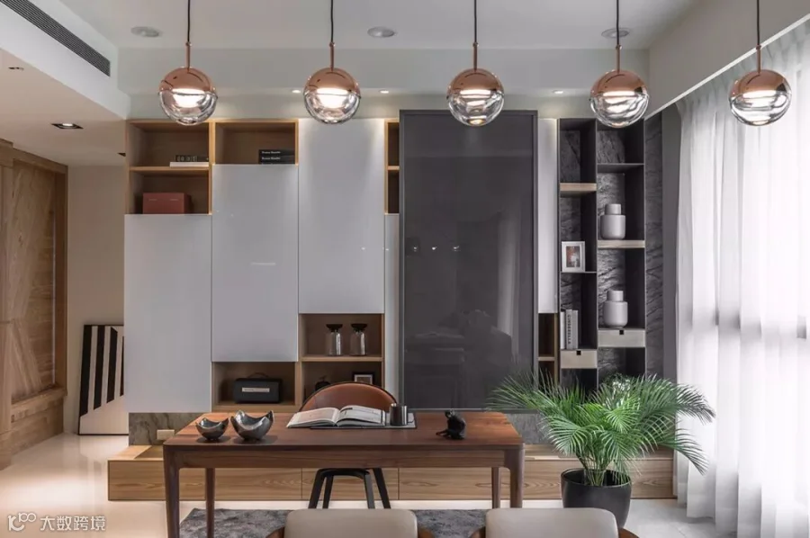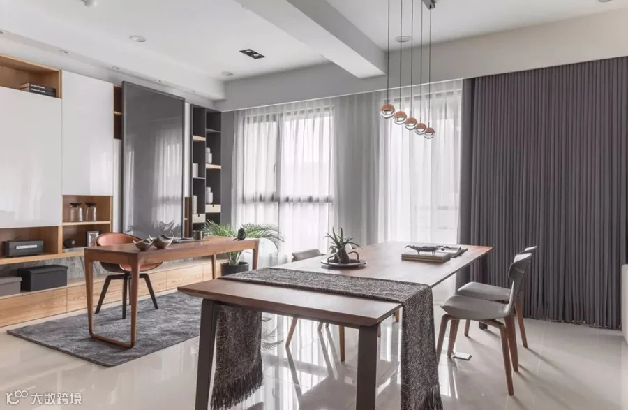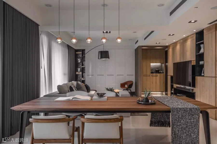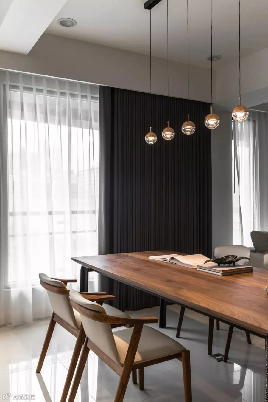黑色灰色,简约不同凡响,木色的家具,艺术感十足的吊灯,不落俗套且很有个性,看似简单随意,却在细节处彰显着艺术美学。