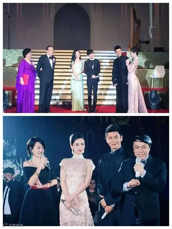 黄晓明的三套西装都是在Tom Ford定制的,入场第一套穿的是一套黑色燕尾服。西装内搭都是白色百褶礼服衬衣,丝质领结和腰封,袖口都是黄金和黑玛瑙做成的,据说所有衣服加起来一共人民币 35 万。