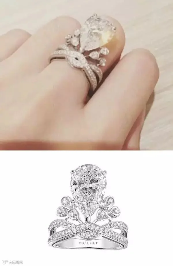 她的订婚钻戒也来自Chaumet ,是Joséphine系列里最华丽的一枚,灵感来自皇帝拿破仑的第一任妻子约瑟芬的皇冠。两人婚前在Chaumet巴黎总部参观,教主一眼挑中了这枚戒指,觉得特别适合他家的水冰月,就豪气地买下来了。主钻是一颗梨形鸽子蛋,另外有 73颗明亮式切割钻石。价格嘛,哈哈哈哈哈哈……
