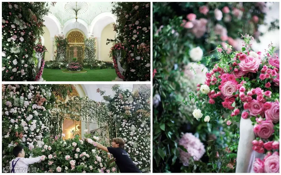 玫瑰用的是世界顶级的ohara玫瑰和潮流之香玫瑰,为了保证婚礼能用到这么多鲜花,野兽派提前好几个月在全世界范围里预定了这一时间段可采摘的玫瑰花。