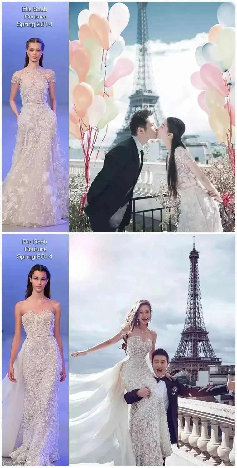 结婚照是在浪漫的法国、浪漫的巴黎、浪漫的埃菲尔铁塔前拍的,Baby穿的浪漫的Elie Saab高定裙子。
