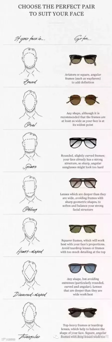 脸型对墨镜的选择起到了决定性的关键作用。看看Buzzfeed上专家总结的脸型与墨镜款式搭配图集,除了椭圆脸型可以傲娇驾驭任何款,其他脸型真心无法任性。