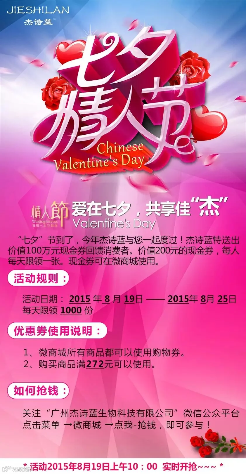 关注“广州杰诗蓝生物科技有限公司”微信公众平台,点击菜单:微商城→ 点我抢钱 即可参与活动!