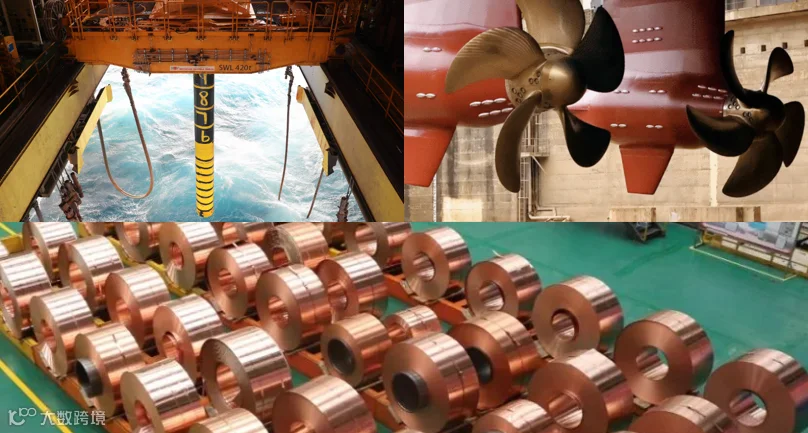 具有优异的耐腐蚀性能的超高强铜合金材料,有棒材、板材、带材等各式规格,其中包括CuNi系、CuNiSn系、CuNiAI合金等,抗拉强度一般在1000MPa以上,具有优异的耐海水腐蚀性能,年平均腐蚀速度约0.008-0.012mm/a,可应用于海洋油气装备钻头轴承、舰船重载装备螺旋桨、轴承、轴瓦、仪器仪表、电子弹性原件等场景。