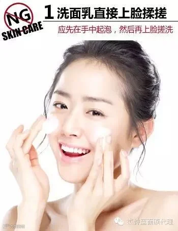 NG1:为了省时,直接把洗面乳放脸上,然后边洗边搓出泡沫。 How to do:应先在手中起泡,然后再上脸搓洗。 Why:洗面奶直接在脸上起泡,或者在没有完全起泡时就放在脸上搓洗,会因为没有泡沫的保护,而会伤害肌肤角质,使肌肤越来越脆弱。