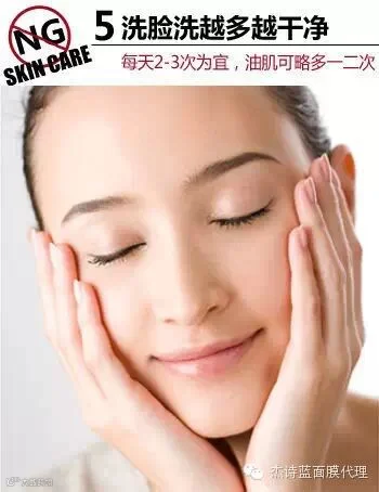 NG5:洗脸洗越多越干净,对皮肤越好。 How to do:洗脸的次数每天2至3次为宜,油性皮肤的人可略多一二次。 Why:洗脸次数增加,面部的脂肪膜很容易不断被洗去,皮肤的保护能力就会降低,而且,经常地刺激皮肤,反而损伤皮肤,会使皮肤失去弹性和光泽,而使皮肤变得十分干燥,皱纹就是这样出现的。所以,洗脸的次数要适宜。