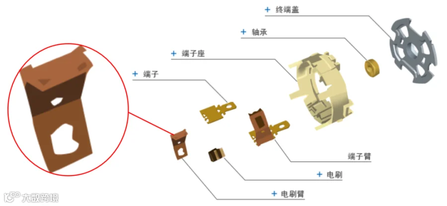 电刷臂是小型马达(也称为小型电动机)中的一个关键组件,它主要负责将电能从电源传递到电动机的转动部分(即转子),从而驱动电动机的旋转,通常需要一定的导电、导热以及抗应力松弛性能,并且还需要有较高的的强度。