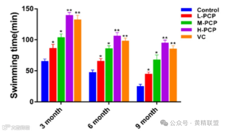 本实验将300只7周龄雄性C57BL/6小鼠(20±2 g)适应性喂养1周后,随机分为3批,每批100只。每批随机分为5组,包括正常组(Control, n = 20)、pcp -低剂量组(L-PCP, 65 mg/Kg/day,n = 20)、pcp -中剂量组(M-PCP, 130 mg/Kg/day,n = 20)、pcp -高剂量组(H-PCP,260 mg/Kg/day,n = 20)和阳性对照组(VC,100 mg/Kg/day,n = 20)。PCP和维生素C溶解在纯水中。在小鼠2、5和8个月大之前,研究人员对它们正常喂食,然后在4周内口服维生素C或不同剂量的PCP。正常组灌胃等量纯水,4周后进行负重游泳试验。在整个实验期间,每只小鼠的体重每周测量一次。从实验结果可以看出,随着喂养时间的延长,3、6、9月龄各组小鼠的平均体重逐渐增加。此外,正常组和PCP治疗组3、6和9个月大的小鼠体重增加无显著差异,这说明PCP并不会影响小鼠的体重从而影响耐力水平(图1)。