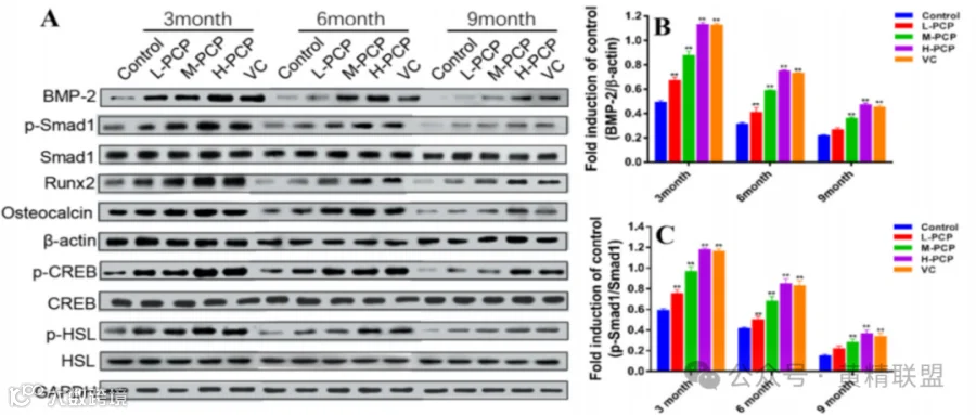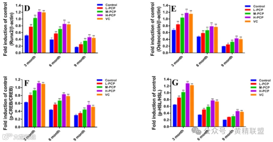 骨钙素是骨形成的标志,由成骨细胞分泌。最近,骨钙素信号被发现在运动过程中通过促进肌肉对葡萄糖和脂肪酸的摄取/利用来维持肌肉功能。同时,骨钙素可以提高宽型小鼠肌肉中HSL磷酸化(Ser563)的水平,为运动提供足够的能量。从图中可以观察到口服PCP可剂量依赖性地增加3、6和9月龄小鼠的BMP-2、磷- smad1、Runx2、磷- creb和磷- hsl的骨架蛋白水平(图7.A-G)。骨钙素含量明显升高,而前面的实验结论也证明了黄精多糖可以增强小鼠的耐力,这表明PCP的抗疲劳作用可能与骨钙素信号介导的能量代谢有关。