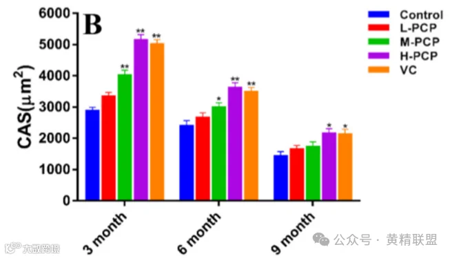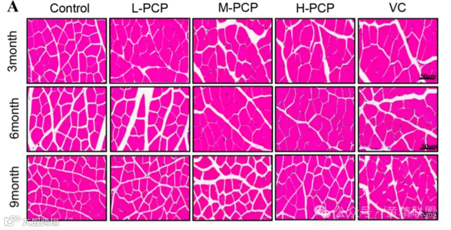 骨骼肌在代谢和运动耐力的调节中起着至关重要的作用。肌纤维的形态特征,如横截面,是衡量肌肉骨骼系统健康和功能的关键指标,事实上骨骼肌的功能与肌纤维有关。与正常组相比,PCP可显著增加3、6、9月龄小鼠肌纤维横截面积,且呈剂量依赖关系,且与力竭游泳时间呈正相关,这表明PCP可改善肌肉骨骼系统功能。