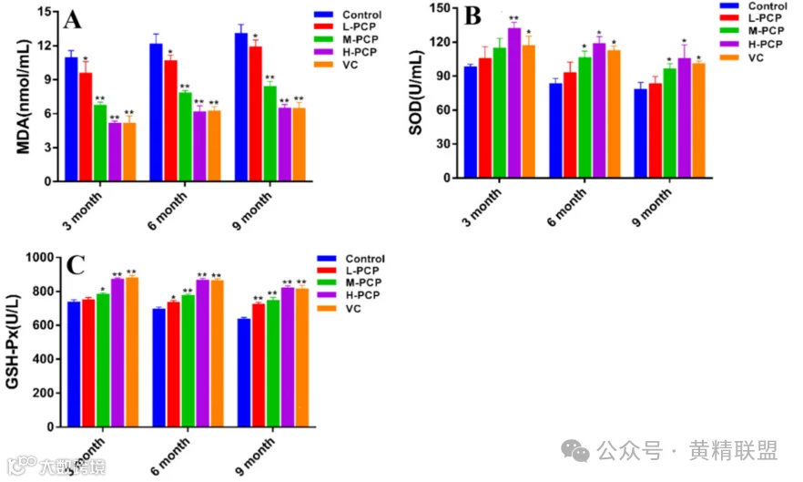 氧自由基的积累是氧化应激和肌肉疲劳的危险因素之一,可通过抗氧化酶消除。MDA是磷脂过氧化的代谢物,是机体氧化损伤的主要指标。SOD和GSH-Px等抗氧化酶在降低活性氧的毒性中起着关键作用。因此,提高抗氧化酶的活性可能有助于减轻疲劳。从下图可以看出,PCP显著提高3、6、9月龄小鼠的SOD和GSH-Px活性,降低MDA含量,且呈剂量依赖性,这说明PCP可以提高抗氧化酶活性,以防止耗尽性运动引起的脂质过氧化和氧化应激(图5)。这些结果表明,PCP的抗氧化性能与抗疲劳活性之间存在相关性。