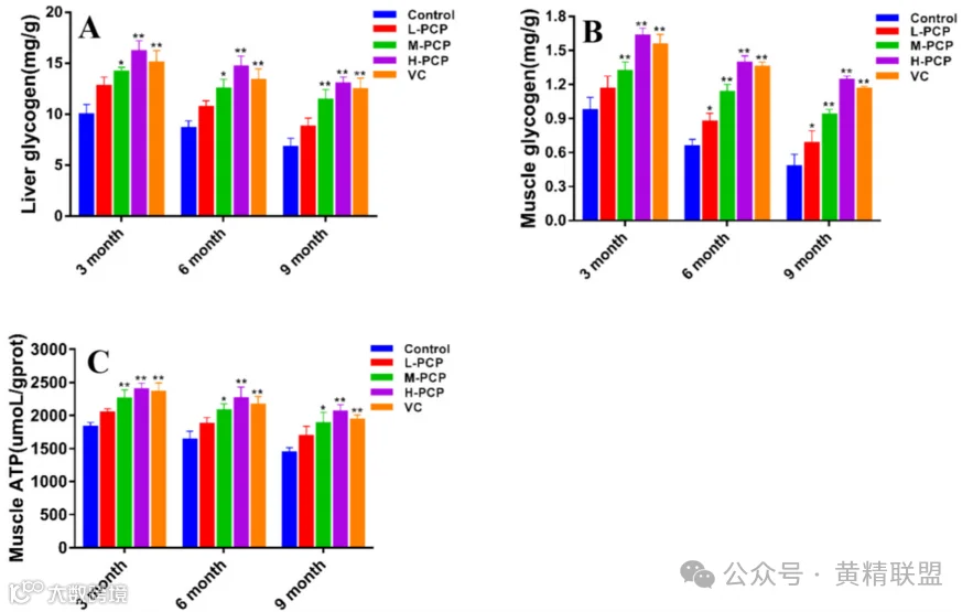 在长时间剧烈运动中,糖原被分解,补充运动消耗的血糖,为机体提供能量。肝脏和骨骼肌中的糖原水平可以反映疲劳程度。糖原储存水平高意味着机体耐受性良好,能够及时补充能量,缓解疲劳。因此,糖原水平的高低直接决定了机体的运动耐力。ATP是正常生理活动的快速能量来源,ATP不足可引起各种生理功能障碍,尤其是在肌肉耐力表现方面。与正常组相比,PCP以剂量依赖的方式提高了3、6和9月龄小鼠的肝脏和肌肉糖原含量,并增加了肌肉中ATP浓度(图4)。这些结果表明PCP可以改善能量代谢系统,提高运动耐力能力。