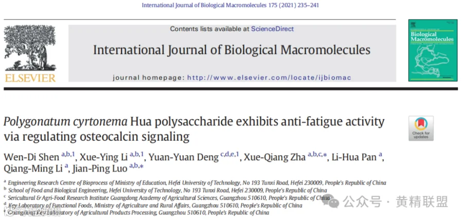 多花黄精(Polgonatum cyrtonema Hua)是一种多年生药食用植物,具有护肾、滋阴、解乏等功效。越来越多的研究表明,多糖是其主要的生物活性物质。最近,从多花黄精中获得了一种相对分子量为8.5 kDa的均质多糖PCP。单糖分析表明,PCP主要由果糖和葡萄糖组成,摩尔比为28:1。迄今为止,虽然从其他药用植物中提取的一些多糖具有抗疲劳活性,但其作用机制尚不清楚。为探究黄精多糖抗疲劳的作用机制,合肥工业大学罗建平教授与查学强教授及其团队通过负重游泳实验评价PCP(黄精多糖)对小鼠的抗疲劳作用。并通过对骨钙素信号通路的研究,从能量代谢的角度进一步阐明PCP缓解疲劳的可能机制。研究成果发表在《International Journal of Biological Macromolecules》(JCR 1区,IF=8.2),题为“Polygonatum cyrtonema Hua polysaccharide exhibits anti-fatigue activity via regulating osteocalcin signaling”的研究论文。