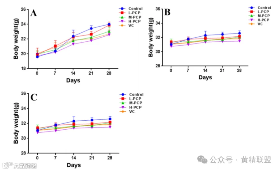 图 1 PCP对小鼠体重变化的影响。(A) 3月龄小鼠;(B) 6月龄小鼠;(C) 9个月大的老鼠