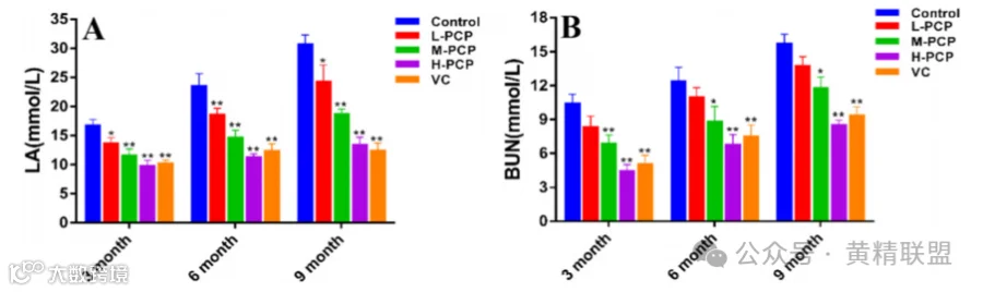 有报道称,力竭游泳运动可导致与疲劳相关的一些血液生化指标发生变化,如LA和BUN。在运动至疲惫期间,碳水化合物糖酵解将葡萄糖转化为LA。LA的过度积累导致肌肉和血液pH值降低,抑制糖酵解相关酶的产生和ATP的合成,导致肌肉疲劳。此外,LA解离产生的H+可以抑制Ca2+与骨骼肌钙蛋白的结合,导致肌肉收缩力受损。与正常组相比,PCP治疗显著降低血清LA水平,且呈剂量依赖性和年龄依赖性(图3.A)。BUN也是评价疲劳的重要指标。在高强度运动中,来自碳水化合物和脂肪代谢的能量不足,为了弥补这一点,蛋白质和氨基酸表现出高分解代谢,导致BUN迅速增加。从图中可以看出,与正常组相比,PCP处理过的小鼠血清BUN水平显著降低,且剂量和年龄呈依赖关系(图3.B)。这些结果表明,PCP可以有效缓解运动后LA和BUN的积累,有助于身体从体力疲劳中恢复过来。
