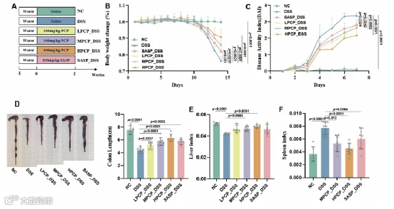 图1.PCP给药改善了小鼠的肠道屏障和炎症反应。(A)实验设计示意图。PCP对结肠炎小鼠的影响。(B)体重变化。(C)DAI分数。(D)结肠长度(cm)。(E,F)肝脏指数和脾脏指数。