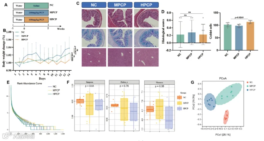 为进一步研究PCP对肠道微生物群的影响,研究进行了实验2(图2A)。接受PCP治疗的小鼠和未接受PCP治疗的小鼠之间的体重变化没有显着差异(图2B)。所有治疗组小鼠结肠和肝组织的组织病理学检查显示无显著差异,表明长期摄入不同剂量的PCP不会导致小鼠组织损伤此外,HPCP干预显著增强了结肠杯状细胞的分泌(图2C、D)。