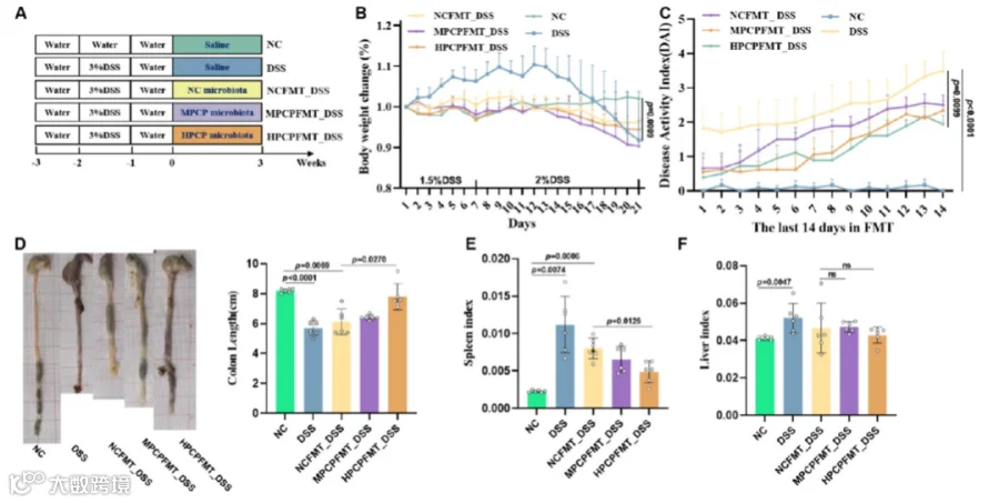 图3.用PCP治疗的小鼠的FMT改善了结肠炎。(A)实验设计示意图。PCP处理小鼠肠道菌群对结肠炎小鼠的影响。(B)体重变化。(C)DAI分数。(D)结肠长度(cm)。(E,F)肝脏指数和脾脏指数。