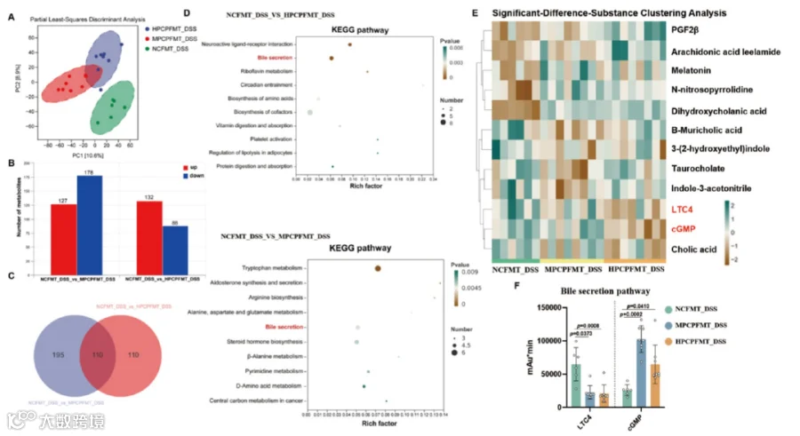 图6.PCP修饰的肠道微生物群调节DSS诱导的结肠炎小鼠的微生物代谢物。(A)主坐标分析。(乙、丙)差异物质筛选和维恩分析。(D)使用KEGG数据库对差异代谢物的代谢途径进行富集分析。(E)差异代谢物聚类分析。(F)LTC4和cGMP的相对水平。