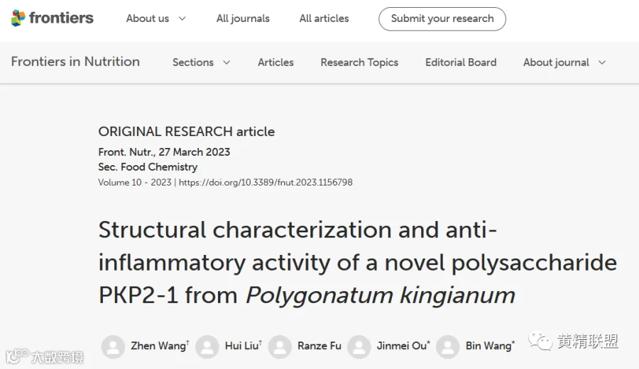 滇黄精(Polygonatum kingianum Coll.et Hemsl.)是黄精的植物来源之一,滇黄精多糖(P. kingianum polysaccharides,PKPs)具有多种生物活性,如抗炎、抗骨质疏松和糖尿病作用,可能与它的多糖结构相关。近期,安徽中医药大学新安医学重点实验室从滇黄精中首次分离出一种新型多糖,PKP2-1,并对该多糖的结构和抗炎活性进行了研究,研究结果在期刊Frontiers in Nutrition(2区,IF5.0)上发表了研究论文“Structural characterization and anti-inflammatory activity of a novel polysaccharide PKP2-1 from Polygonatum kingianum”。