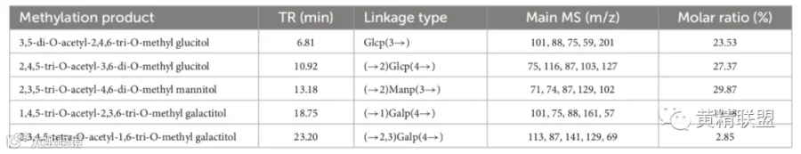 PKP2-1经三氟乙酸水解、衍生化后,采用气相色谱质谱法分析测定其单糖组成。结果表明,PKP2-1由葡萄糖(Glc)、半乳糖(Gal)、甘露糖(Man)和葡糖酸(GlcA)组成,其摩尔比约为6:2:2:1。进一步通过甲基化和乙酰化反应鉴定PKP2-1中糖苷键的连接类型。表明PKP21由(→2)葡萄糖残基(Glcp)(4→, 葡萄糖残基(3→,→2)甘露糖残基(Manp)(3→,→2,3半乳糖残基(Galp)(4→,→1)半乳糖残基(4→摩尔比为27.37:23.53:29.87:2.85:16.38)组成(表1)。