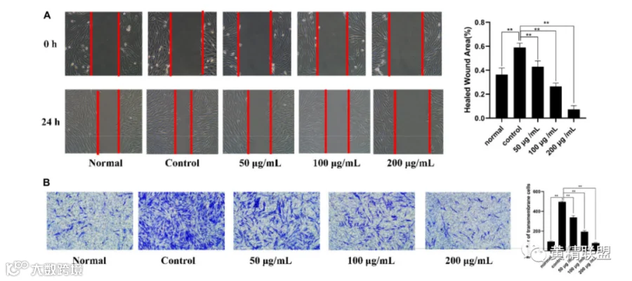 细胞划痕实验通过测量划痕宽度来评估细胞的迁移能力。首先,在0h下观察正常组、对照组和不同浓度(50、100、200 µg/ml)PKP2-1组的MH7A细胞愈合状态。24h后观察并记录划痕宽度(图5A),计算细胞迁移率。结果显示,正常组和对照组(TNF-α刺激)细胞迁移率分别为36.4%和59.0%。三种浓度的PKP2-1处理MH7A细胞24h后,细胞迁移率分别为43%、26%、7%。发现50µg/ml的PKP2-1组MH7A细胞迁移率降低,当PKP2-1浓度达到200µg/ml时迁移率明显降低,表明PKP2-1可以有效地抑制MH7A细胞的迁移。