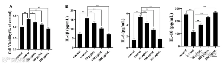 酶联免疫吸附试验法(Enzyme-Linked Immunosorbent Assay,ELISA)检可以测PKP2-1对MH7A细胞中细胞因子IL1β、IL-6、IL-10表达的影响。正常组MH7A细胞中促炎细胞因子IL6和IL-1β的含量分别为1.36和7.41 pg/ml。经TNF-α刺激后,IL-6和IL-1β含量分别提高至5.40和15.81 pg/ml,l高于正常组。然而,使用不同浓度的PKP2-1处理MH7A细胞24 h后,观察到IL-6和IL-1β的含量降低,表明PKP2-1可以抑制促炎细胞因子的产生。同时,正常组和对照组中抗炎细胞因子IL-10的含量分别为253.41和115.32pg/ml。当PKP2-1浓度为50、100、200µg/ml作l用MH7A细胞24h时,IL-10的含量分别为171.65、231.01、269.18pg/ml,说明PKP2-1能够促进抗炎因子的产生。这些结果表明PKP2-1的抗炎活性与浓度相关(图4B)。
