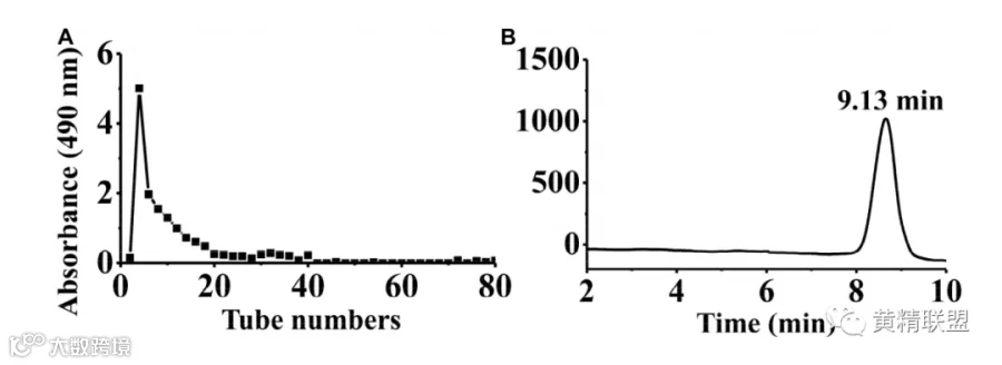 图1:PKP2-1的理化性质分析 (A) PKP2洗脱的SEC图谱;(B) PKP2-1的HPGPC分析
