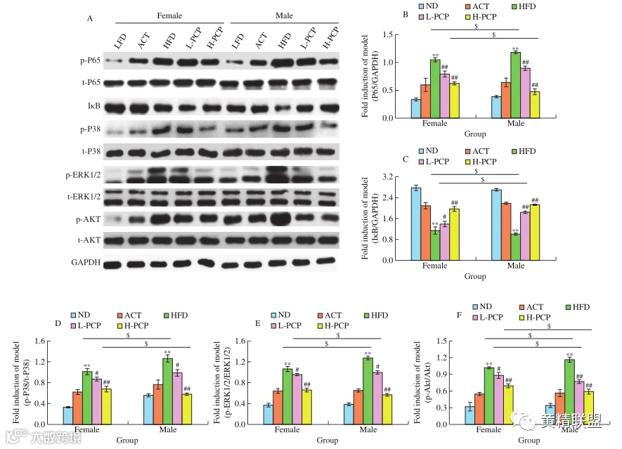 喂养的雌性和雄性小鼠主动脉中炎症信号通路蛋白质水平的影响。蛋白质印迹分析(