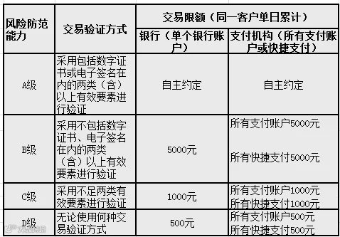对于使用动态条码(如手机上实时生成的条码)进行支付的,风险防范能力根据交易验证方式不同分为A、B、C三级,同一客户单日累计交易限额分别为自主约定、5000元、1000元。