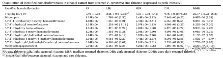 表1. 不同蒸制程度下多花黄精根茎乙醇提取物中鉴定的高异黄酮类化合物的定量(以峰强度表示)。