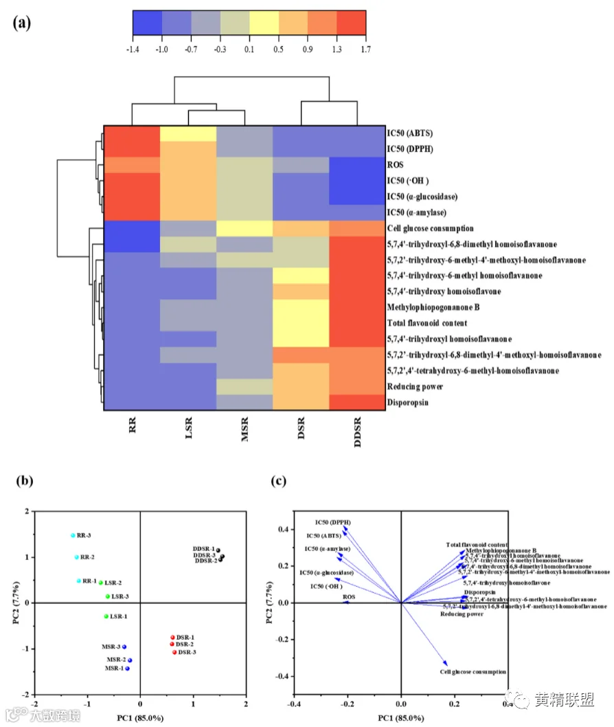 主成分分析(PCA)是一种线性变换,用于突出许多不同变量的实际影响。根据总黄酮含量、鉴定的类黄酮、抗氧化活性、淀粉相关消化酶抑制活性、细胞葡萄糖消耗和活性氧生成[图7 (b) 和 (c)]进行测定。总变异来自PC1和PC2,分别占85%和7.7%。PC1中的重要变量是总黄酮含量、九种同型异黄酮和降血糖活性。 PC2中存在细胞葡萄糖消耗、DPPH自由基清除能力(IC50)和ABTS自由基清除能力(IC50)。多花黄精根茎的明显分离和区分反映了蒸制后高异黄酮成分和生物活性的显着差异。结果表明,蒸制程度和高异黄酮类化合物对这些生物活性有很大影响。