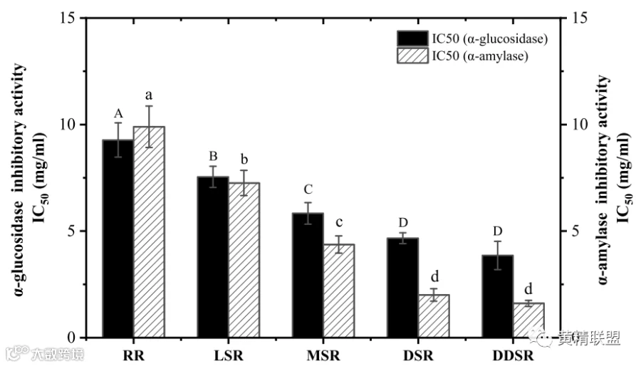 图 3. 不同蒸制程度多花黄精根茎乙醇提取物对α-淀粉酶和α-葡萄糖苷酶的抑制作用。