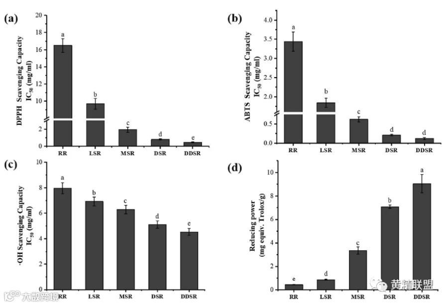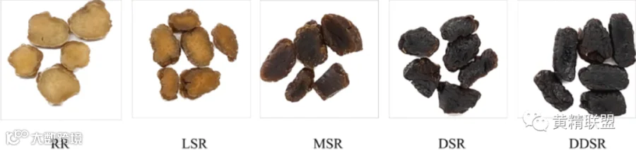 图1. 不同蒸制程度的黄花根颜色(RR:生根茎;LSR:浅蒸根茎;MSR:中蒸根茎;DSR:高蒸根茎;DDSR:深蒸根茎)。