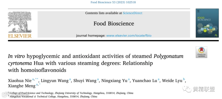 论文“In vitro hypoglycemic and antioxidant activities of steamed Polygonatum cyrtonema Hua with various steaming degrees: Relationship with homoisoflavonoids”研究了不同蒸制程度的多花黄精根茎中高异黄酮的组成、降血糖和抗氧化活性,并分析了高异黄酮对这些活性的贡献,发表在期刊Food Biosience(中科院二区,IF:5.2)上,浙江工业大学食品学院聂晓华为论文第一作者,孟祥河教授为论文的通讯作者。