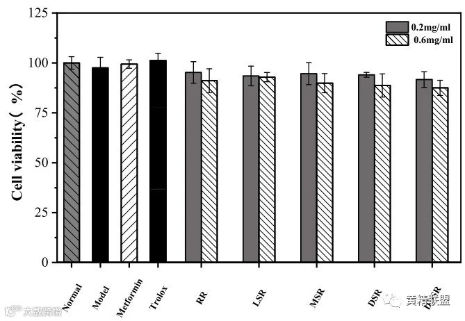 不同蒸制程度多花黄精根茎乙醇提取物处理的IR-HepG2细胞的细胞活力如图4所示。用MTT方法测定,用根茎提取物处理IR-HepG2细胞没有引起细胞活力的显着变化。该结果表明,这些含量的根茎提取物对细胞没有表现出毒副作用。
