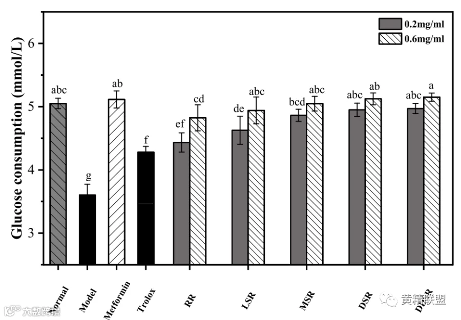 图 5. 不同蒸制程度多花黄精根茎乙醇提取物处理对IR-HepG2 细胞的葡萄糖消耗的影响。